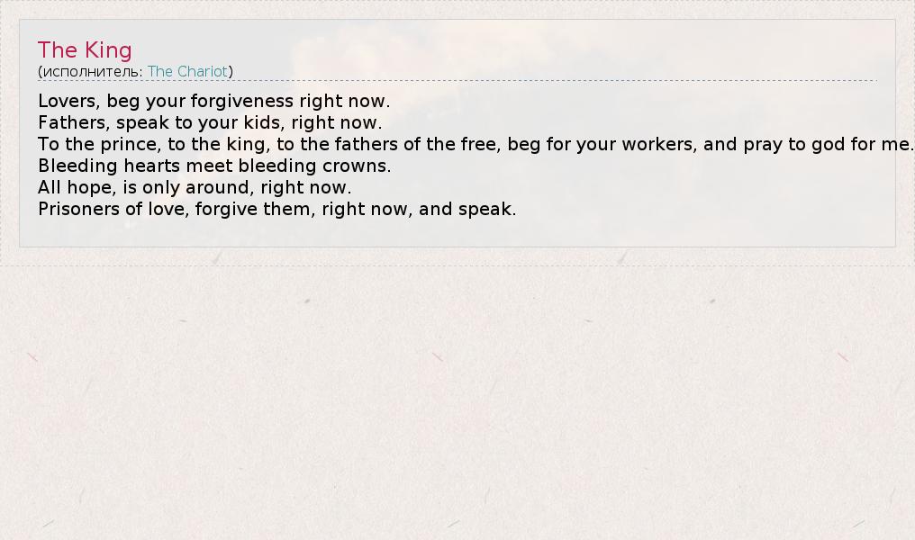 Это интересно:Группа The Chariot появилась после того, как Джош Скожин в 2002 году покинул состав Norma Jean в пик успеха команды, чем смутил многих фэнов. Джош был известен своими крайне эмоциональными живыми выступлениями, поскольку во время исполнения песен он мог ползать по полу или скакать как бесноватый из стороны в сторону. О своем существовании группа заявила в 2002 году на фесте Furnace.... продолжение