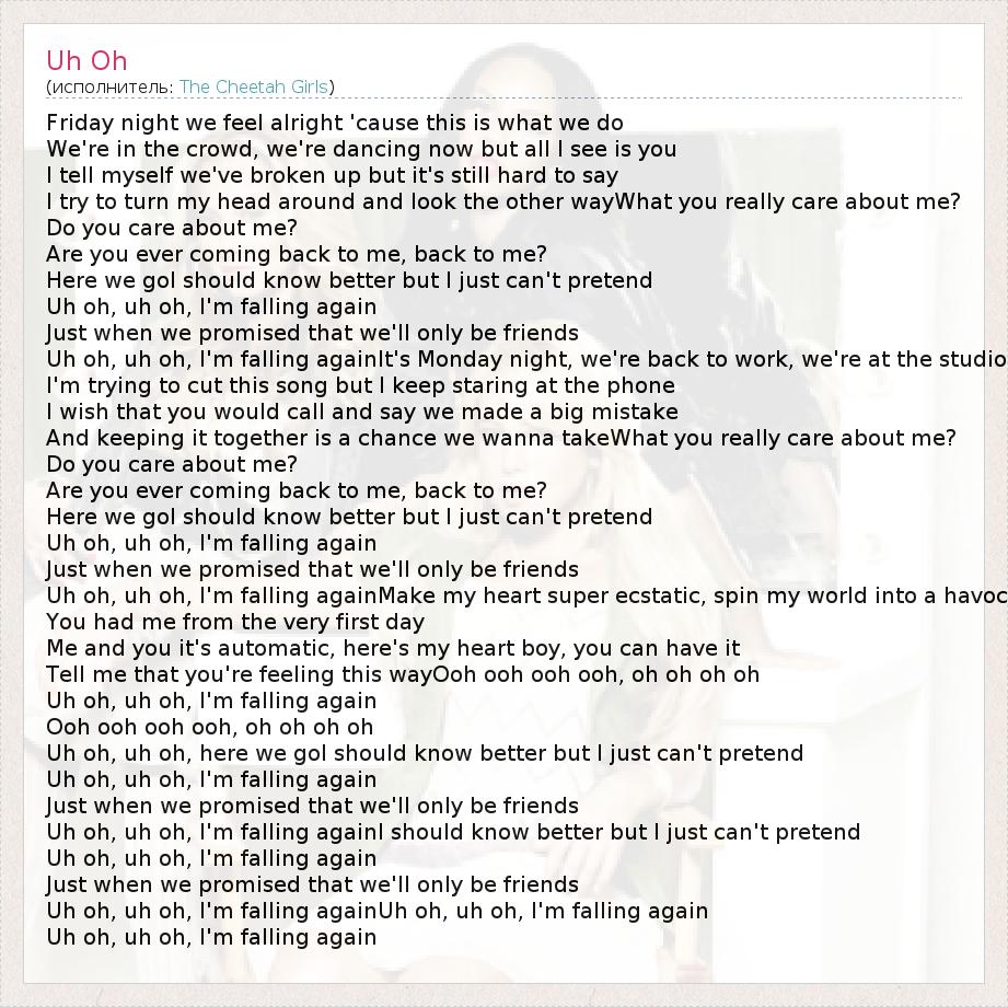 Friday night we feel alright 'cause this is what we do We're in the crowd, we're dancing now but all I see is you I tell myself we've broken up but it's still hard to say I try to turn my head around and look the other wayWhat you really care about me? Do you care about me? Are you ever coming back to me, back to me? Here we goI should know better but I just can't pretend Uh oh, uh oh, I'm falling again Just when we promised that we'll only be friends Uh oh, uh oh, I'm falling againIt's Monday night, we're back to work, we're at the studio I'm trying to cut this song but I keep staring at the phone I wish that you would call and say we made a big mistake And keeping it together is a chance we wanna takeWhat you really care about me? Do you care about me? Are you ever coming back to me, back to me? Here we goI should know better but I just can't pretend Uh oh, uh oh, I'm falling again Just when we promised that we'll only be friends Uh oh, uh oh, I'm falling againMake my heart super ecstatic, spin my world into a havoc You had me from the very first day Me and you it's automatic, here's my heart boy, you can have it Tell me that you're feeling this wayOoh ooh ooh ooh, oh oh oh oh Uh oh, uh oh, I'm falling again Ooh ooh ooh ooh, oh oh oh oh Uh oh, uh oh, here we goI should know better but I just can't pretend Uh oh, uh oh, I'm falling again Just when we promised that we'll only be friends Uh oh, uh oh, I'm falling againI should know better but I just can't pretend Uh oh, uh oh, I'm falling again Just when we promised that we'll only be friends Uh oh, uh oh, I'm falling againUh oh, uh oh, I'm falling again Uh oh, uh oh, I'm falling again