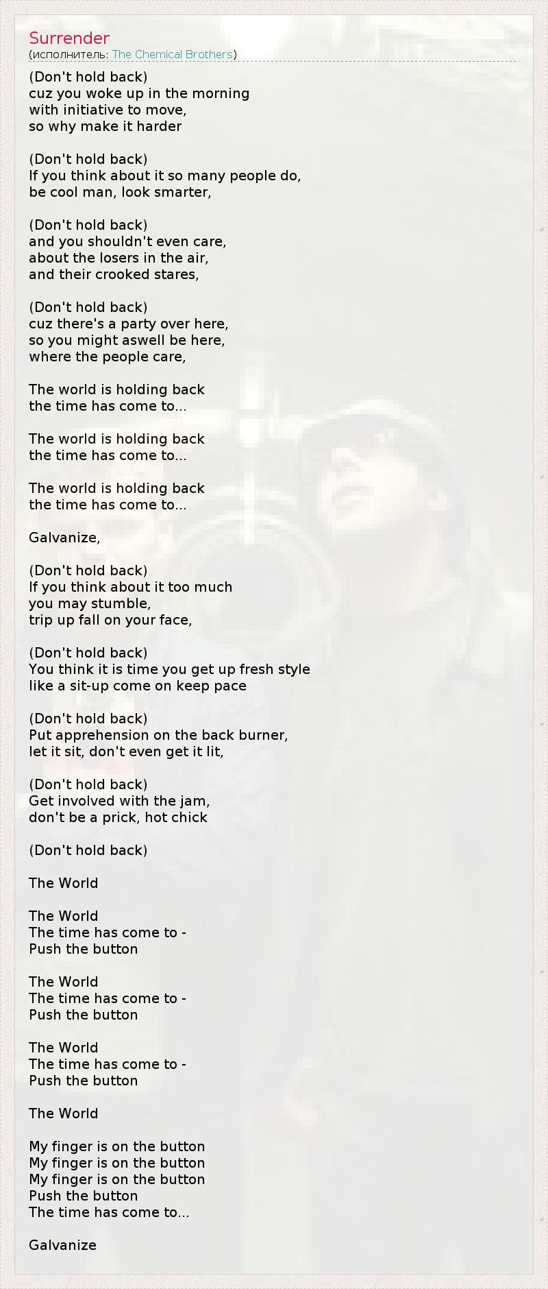 (Don't hold back) cuz you woke up in the morning with initiative to move, so why make it harder (Don't hold back) If you think about it so many people do, be cool man, look smarter, (Don't hold back) and you shouldn't even care, about the losers in the air, and their crooked stares, (Don't hold back) cuz there's a party over here, so you might aswell be here, where the people care, The world is holding back the time has come to... The world is holding back the time has come to... The world is holding back the time has come to... Galvanize, (Don't hold back) If you think about it too much you may stumble, trip up fall on your face, (Don't hold back) You think it is time you get up fresh style like a sit-up come on keep pace (Don't hold back) Put apprehension on the back burner, let it sit, don't even get it lit, (Don't hold back) Get involved with the jam, don't be a prick, hot chick (Don't hold back) The World The World The time has come to - Push the button The World The time has come to - Push the button The World The time has come to - Push the button The World My finger is on the button My finger is on the button My finger is on the button Push the button The time has come to... Galvanize