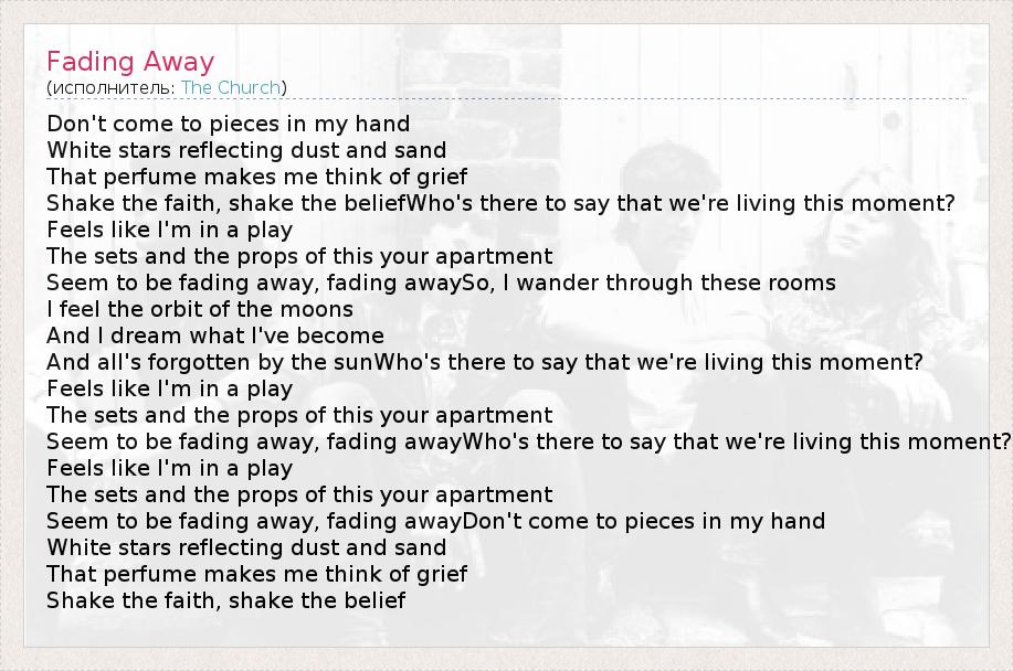 Don't come to pieces in my hand White stars reflecting dust and sand That perfume makes me think of grief Shake the faith, shake the beliefWho's there to say that we're living this moment? Feels like I'm in a play The sets and the props of this your apartment Seem to be fading away, fading awaySo, I wander through these rooms I feel the orbit of the moons And I dream what I've become And all's forgotten by the sunWho's there to say that we're living this moment? Feels like I'm in a play The sets and the props of this your apartment Seem to be fading away, fading awayWho's there to say that we're living this moment? Feels like I'm in a play The sets and the props of this your apartment Seem to be fading away, fading awayDon't come to pieces in my hand White stars reflecting dust and sand That perfume makes me think of grief Shake the faith, shake the belief