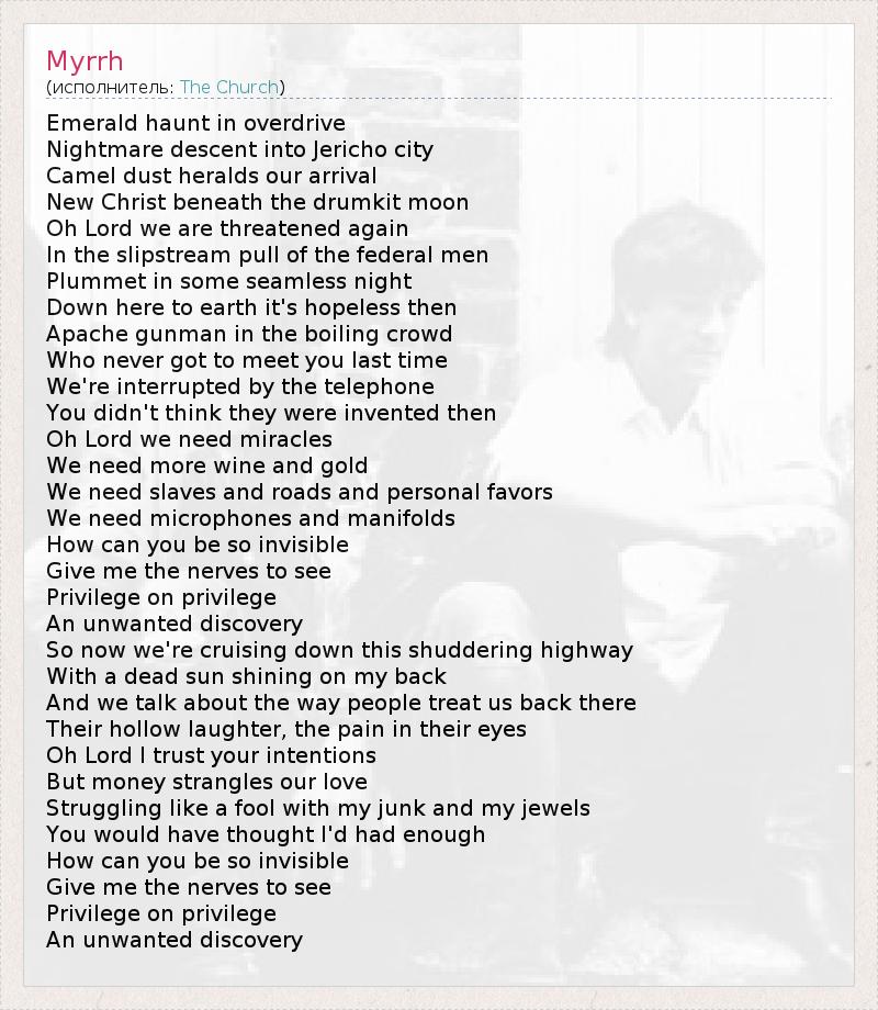 Emerald haunt in overdrive Nightmare descent into Jericho city Camel dust heralds our arrival New Christ beneath the drumkit moon Oh Lord we are threatened again In the slipstream pull of the federal men Plummet in some seamless night Down here to earth it's hopeless then Apache gunman in the boiling crowd Who never got to meet you last time We're interrupted by the telephone You didn't think they were invented then Oh Lord we need miracles We need more wine and gold We need slaves and roads and personal favors We need microphones and manifolds How can you be so invisible Give me the nerves to see Privilege on privilege An unwanted discovery So now we're cruising down this shuddering highway With a dead sun shining on my back And we talk about the way people treat us back there Their hollow laughter, the pain in their eyes Oh Lord I trust your intentions But money strangles our love Struggling like a fool with my junk and my jewels You would have thought I'd had enough How can you be so invisible Give me the nerves to see Privilege on privilege An unwanted discovery