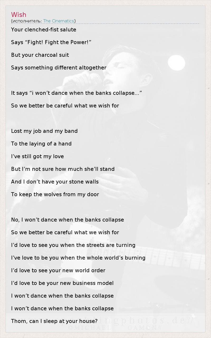 It says “i won’t dance when the banks collapse...”