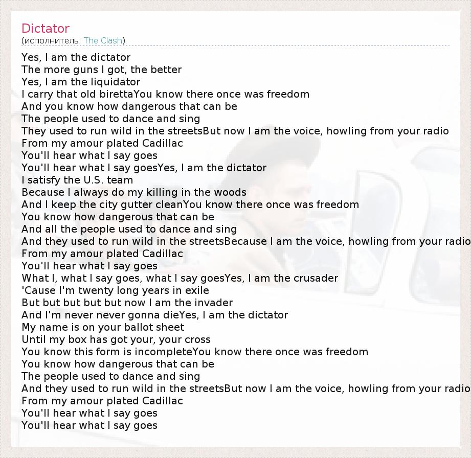 Yes, I am the dictator The more guns I got, the better Yes, I am the liquidator I carry that old birettaYou know there once was freedom And you know how dangerous that can be The people used to dance and sing They used to run wild in the streetsBut now I am the voice, howling from your radio From my amour plated Cadillac You'll hear what I say goes You'll hear what I say goesYes, I am the dictator I satisfy the U.S. team Because I always do my killing in the woods And I keep the city gutter cleanYou know there once was freedom You know how dangerous that can be And all the people used to dance and sing And they used to run wild in the streetsBecause I am the voice, howling from your radio From my amour plated Cadillac You'll hear what I say goes What I, what I say goes, what I say goesYes, I am the crusader 'Cause I'm twenty long years in exile But but but but but now I am the invader And I'm never never gonna dieYes, I am the dictator My name is on your ballot sheet Until my box has got your, your cross You know this form is incompleteYou know there once was freedom You know how dangerous that can be The people used to dance and sing And they used to run wild in the streetsBut now I am the voice, howling from your radio From my amour plated Cadillac You'll hear what I say goes You'll hear what I say goes