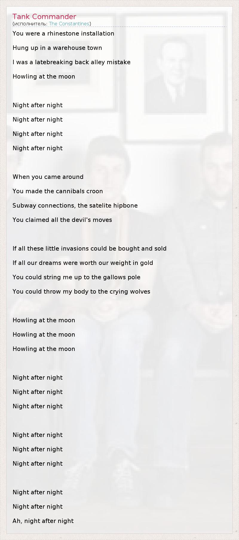 You were a rhinestone installation Hung up in a warehouse town I was a latebreaking back alley mistake Howling at the moon Night after night Night after night Night after night Night after night When you came around You made the cannibals croon Subway connections, the satelite hipbone You claimed all the devil's moves If all these little invasions could be bought and sold If all our dreams were worth our weight in gold You could string me up to the gallows pole You could throw my body to the crying wolves Howling at the moon Howling at the moon Howling at the moon Night after night Night after night Night after night Night after night Night after night Night after night Night after night Night after night Ah, night after night