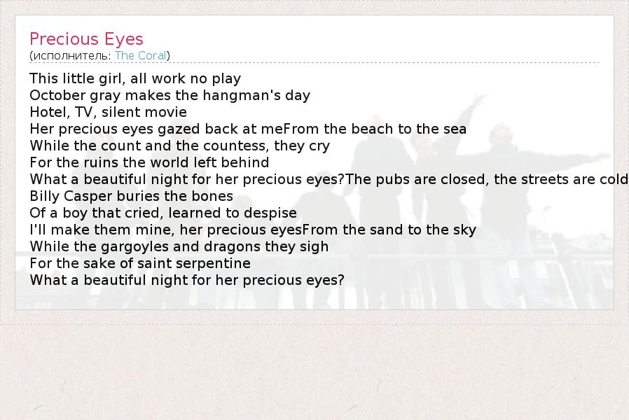 А как ты думаешь, о чем песня "Precious Eyes" ?