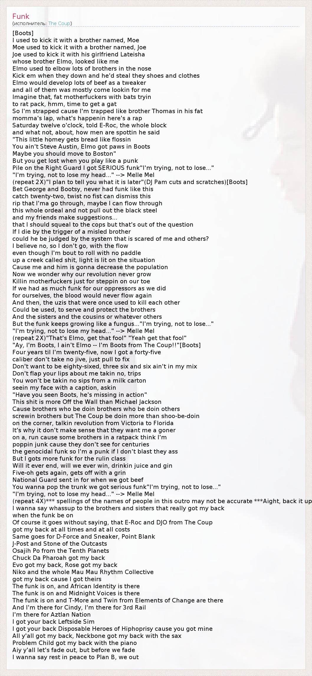 "Ay, I'm Boots, I ain't Elmo -- I'm Boots from The Coup!!"[Boots]