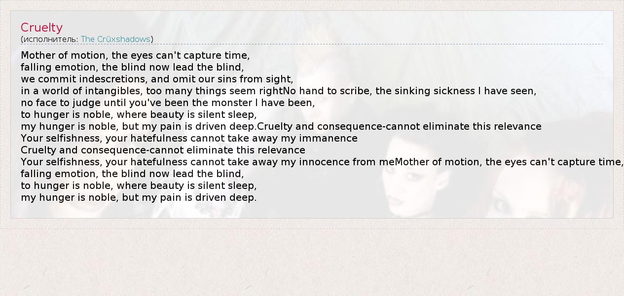 Это интересно:Одна из самых популярных Dark Electro команд в мире - the Crüxshadows, начала свой путь в начале 90-х в маленьком городке в Северной Флориде. 15 лет успешных выступлений в таких жанрах, как gothic, ebm, new wave, & dark electronic сделали их легендарной группой мировом андерграунде. Они отыграли сотни концертов по всему миру. The Crüxshadows - первая группа готического жанра, получившая разрешение играть в Китае. Команда... продолжение