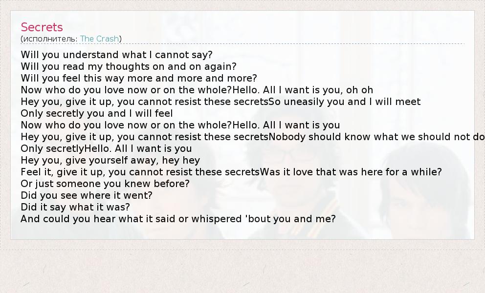 Feel it, give it up, you cannot resist these secretsWas it love that was here for a while?