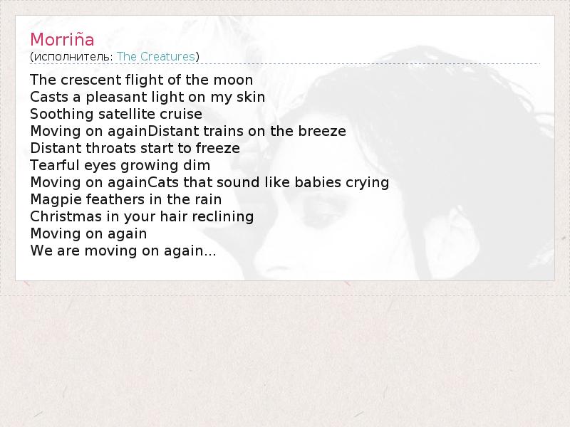 The crescent flight of the moon Casts a pleasant light on my skin Soothing satellite cruise Moving on againDistant trains on the breeze Distant throats start to freeze Tearful eyes growing dim Moving on againCats that sound like babies crying Magpie feathers in the rain Christmas in your hair reclining Moving on again We are moving on again...