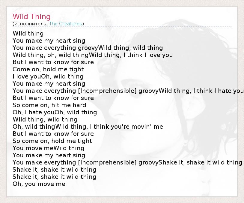 Wild thing You make my heart sing You make everything groovyWild thing, wild thing Wild thing, oh, wild thingWild thing, I think I love you But I want to know for sure Come on, hold me tight I love youOh, wild thing You make my heart sing You make everything [Incomprehensible] groovyWild thing, I think I hate you But I want to know for sure So come on, hit me hard Oh, I hate youOh, wild thing Wild thing, wild thing Oh, wild thingWild thing, I think you're movin' me But I want to know for sure So come on, hold me tight You move meWild thing You make my heart sing You make everything [Incomprehensible] groovyShake it, shake it wild thing Shake it, shake it wild thing Shake it, shake it wild thing Oh, you move me