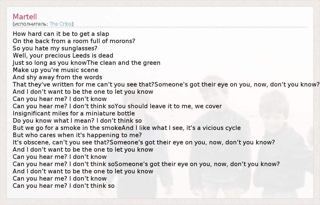 Это интересно:The Cribs — это инди-рок группа из Вейкфилда, графства Западный Йоркшир, Великобритания. Группа состоит из братьев-близнецов Гарри и Райана Ярман и их младшего брата Росса Ярмана. Впоследствии к ним присоединился бывший гитарист The Smiths и Modest Mouse Джонни Марр, который стал официальным членом группы в 2008 году. Марр оставался в составе группы до 2011 года; об его уходе было официально объявлено 11... продолжение