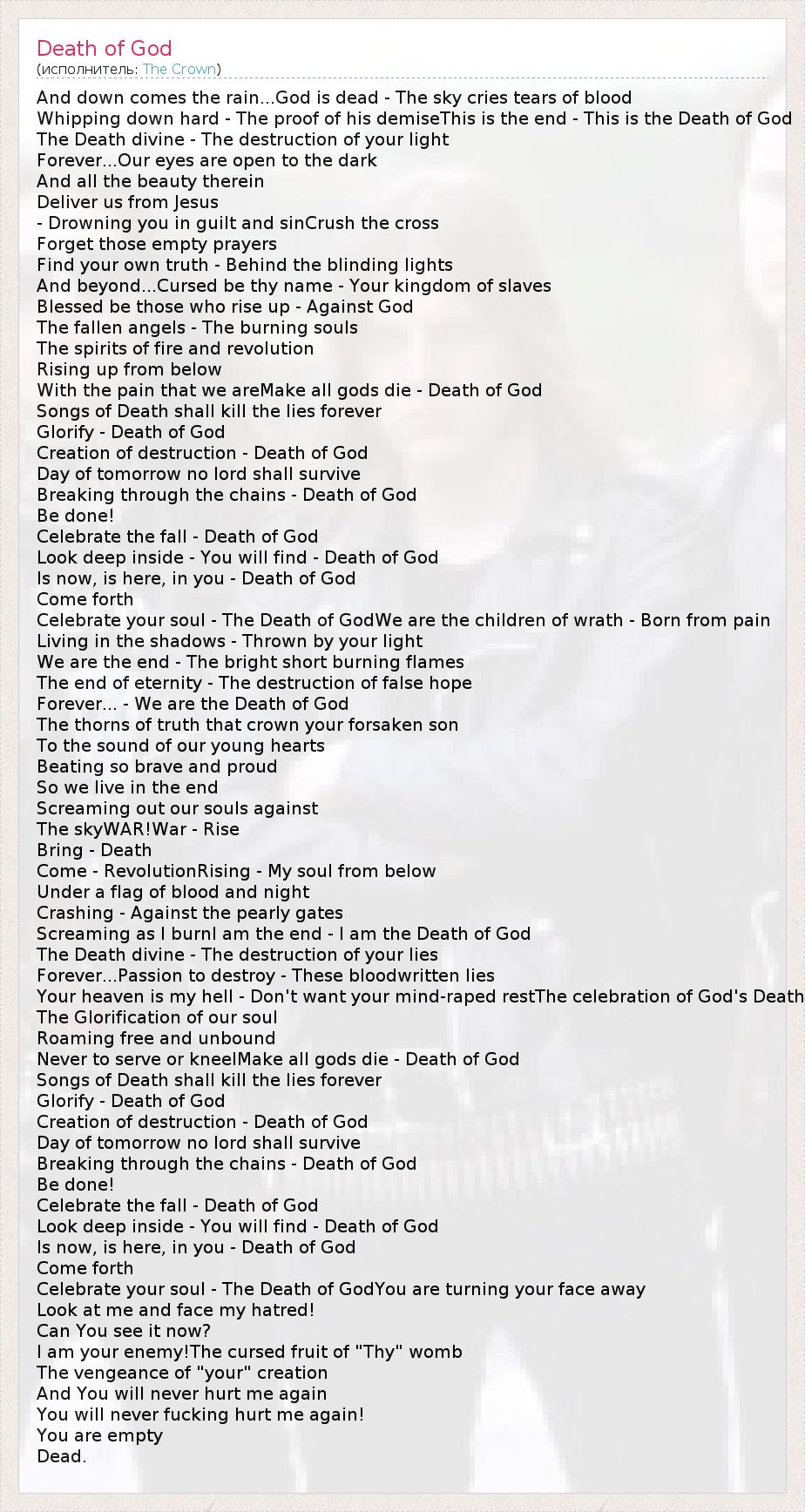 And down comes the rain...God is dead - The sky cries tears of blood Whipping down hard - The proof of his demiseThis is the end - This is the Death of God The Death divine - The destruction of your light Forever...Our eyes are open to the dark And all the beauty therein Deliver us from Jesus - Drowning you in guilt and sinCrush the cross Forget those empty prayers Find your own truth - Behind the blinding lights And beyond...Cursed be thy name - Your kingdom of slaves Blessed be those who rise up - Against God The fallen angels - The burning souls The spirits of fire and revolution Rising up from below With the pain that we areMake all gods die - Death of God Songs of Death shall kill the lies forever Glorify - Death of God Creation of destruction - Death of God Day of tomorrow no lord shall survive Breaking through the chains - Death of God Be done! Celebrate the fall - Death of God Look deep inside - You will find - Death of God Is now, is here, in you - Death of God Come forth Celebrate your soul - The Death of GodWe are the children of wrath - Born from pain Living in the shadows - Thrown by your light We are the end - The bright short burning flames The end of eternity - The destruction of false hope Forever... - We are the Death of God The thorns of truth that crown your forsaken son To the sound of our young hearts Beating so brave and proud So we live in the end Screaming out our souls against The skyWAR!War - Rise Bring - Death Come - RevolutionRising - My soul from below Under a flag of blood and night Crashing - Against the pearly gates Screaming as I burnI am the end - I am the Death of God The Death divine - The destruction of your lies Forever...Passion to destroy - These bloodwritten lies Your heaven is my hell - Don't want your mind-raped restThe celebration of God's Death The Glorification of our soul Roaming free and unbound Never to serve or kneelMake all gods die - Death of God Songs of Death shall kill the lies forever Glorify - Death of God Creation of destruction - Death of God Day of tomorrow no lord shall survive Breaking through the chains - Death of God Be done! Celebrate the fall - Death of God Look deep inside - You will find - Death of God Is now, is here, in you - Death of God Come forth Celebrate your soul - The Death of GodYou are turning your face away Look at me and face my hatred! Can You see it now? I am your enemy!The cursed fruit of "Thy" womb The vengeance of "your" creation And You will never hurt me again You will never fucking hurt me again! You are empty Dead.