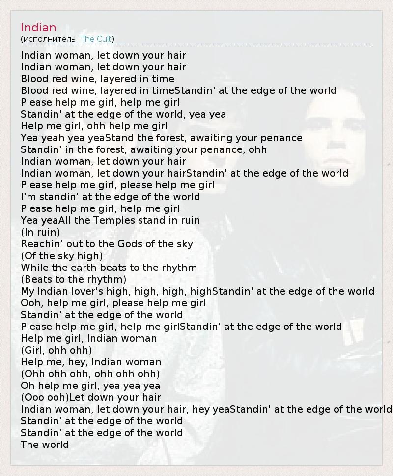 Indian woman, let down your hair, hey yeaStandin' at the edge of the world