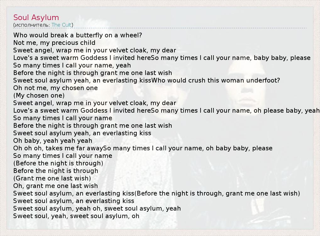 Who would break a butterfly on a wheel? Not me, my precious child Sweet angel, wrap me in your velvet cloak, my dear Love's a sweet warm Goddess I invited hereSo many times I call your name, baby baby, please So many times I call your name, yeah Before the night is through grant me one last wish Sweet soul asylum yeah, an everlasting kissWho would crush this woman underfoot? Oh not me, my chosen one (My chosen one) Sweet angel, wrap me in your velvet cloak, my dear Love's a sweet warm Goddess I invited hereSo many times I call your name, oh please baby, yeah So many times I call your name Before the night is through grant me one last wish Sweet soul asylum yeah, an everlasting kiss Oh baby, yeah yeah yeah Oh oh oh, takes me far awaySo many times I call your name, oh baby baby, please So many times I call your name (Before the night is through) Before the night is through (Grant me one last wish) Oh, grant me one last wish Sweet soul asylum, an everlasting kiss(Before the night is through, grant me one last wish) Sweet soul asylum, an everlasting kiss Sweet soul asylum, yeah oh, sweet soul asylum, yeah Sweet soul, yeah, sweet soul asylum, oh