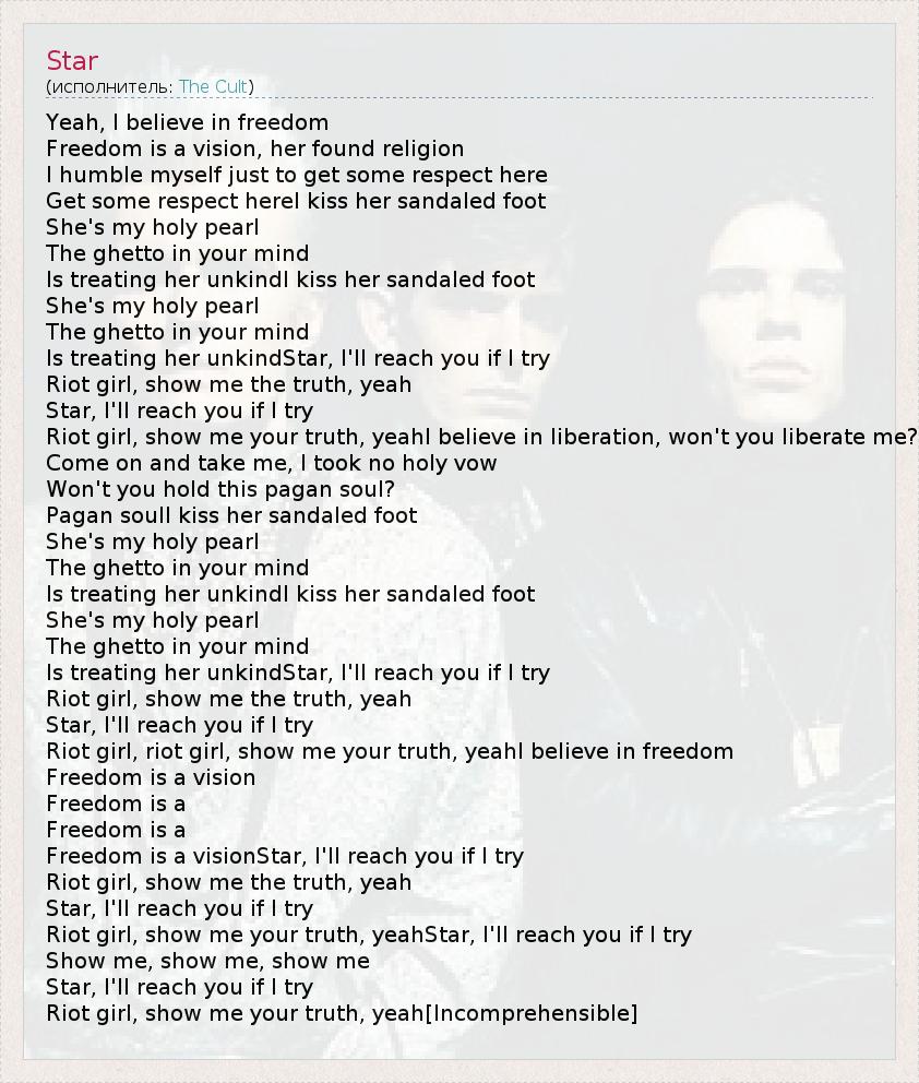 Riot girl, riot girl, show me your truth, yeahI believe in freedom