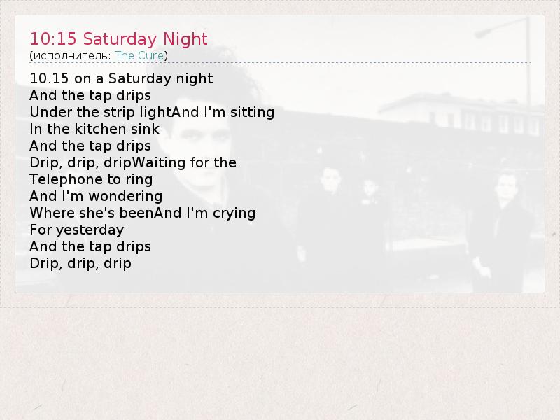 10.15 on a Saturday night And the tap drips Under the strip lightAnd I'm sitting In the kitchen sink And the tap drips Drip, drip, dripWaiting for the Telephone to ring And I'm wondering Where she's beenAnd I'm crying For yesterday And the tap drips Drip, drip, drip