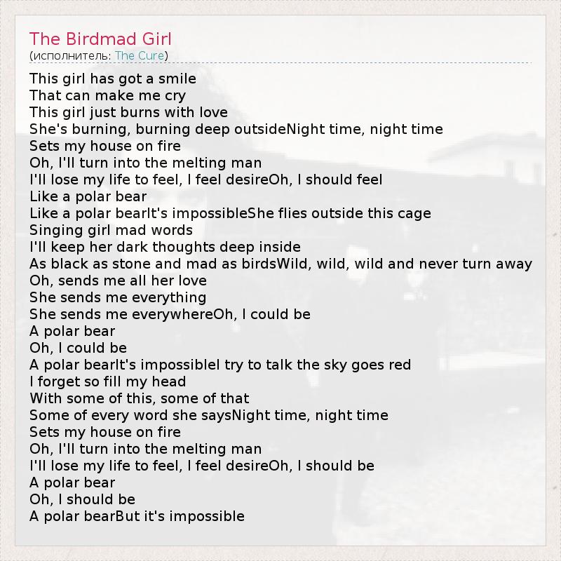 А как ты думаешь, о чем песня "The Birdmad Girl" ?