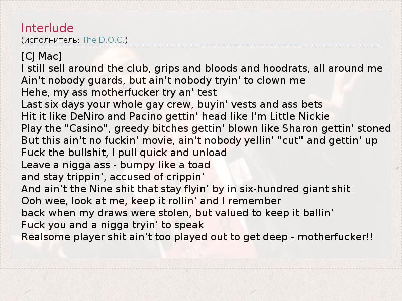 Это интересно:The D.O.C. (Tracy Lynn Curry) - родился 10 июня 1968 года в Хьюстоне, позже перебрался в Даллас. The D.O.C. присоединился к N.W.A в 1986 году как рэппер. После первого альбома группы "N.W.A and the Posse" он покидает группу. Однако, после того, как Ice Cube покинул группу в 1987 году, некому было больше сочинять тексты и The D.O.C. возвращается в коллектив как сочинитель. Трэйси стал автором текстов... продолжение