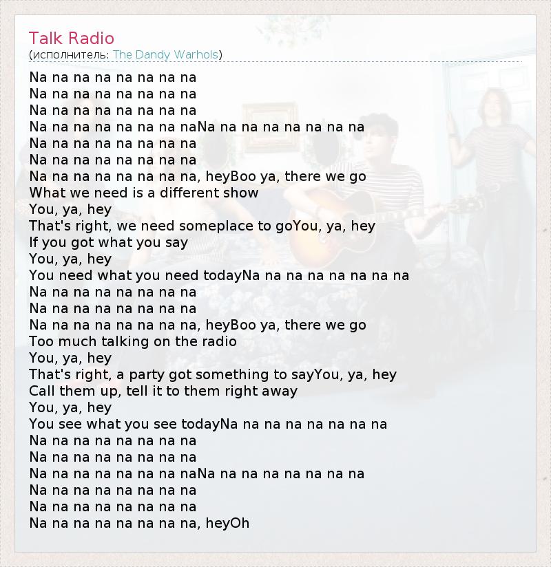 Na na na na na na na na Na na na na na na na na Na na na na na na na na Na na na na na na na naNa na na na na na na na Na na na na na na na na Na na na na na na na na Na na na na na na na na, heyBoo ya, there we go What we need is a different show You, ya, hey That's right, we need someplace to goYou, ya, hey If you got what you say You, ya, hey You need what you need todayNa na na na na na na na Na na na na na na na na Na na na na na na na na Na na na na na na na na, heyBoo ya, there we go Too much talking on the radio You, ya, hey That's right, a party got something to sayYou, ya, hey Call them up, tell it to them right away You, ya, hey You see what you see todayNa na na na na na na na Na na na na na na na na Na na na na na na na na Na na na na na na na naNa na na na na na na na Na na na na na na na na Na na na na na na na na Na na na na na na na na, heyOh