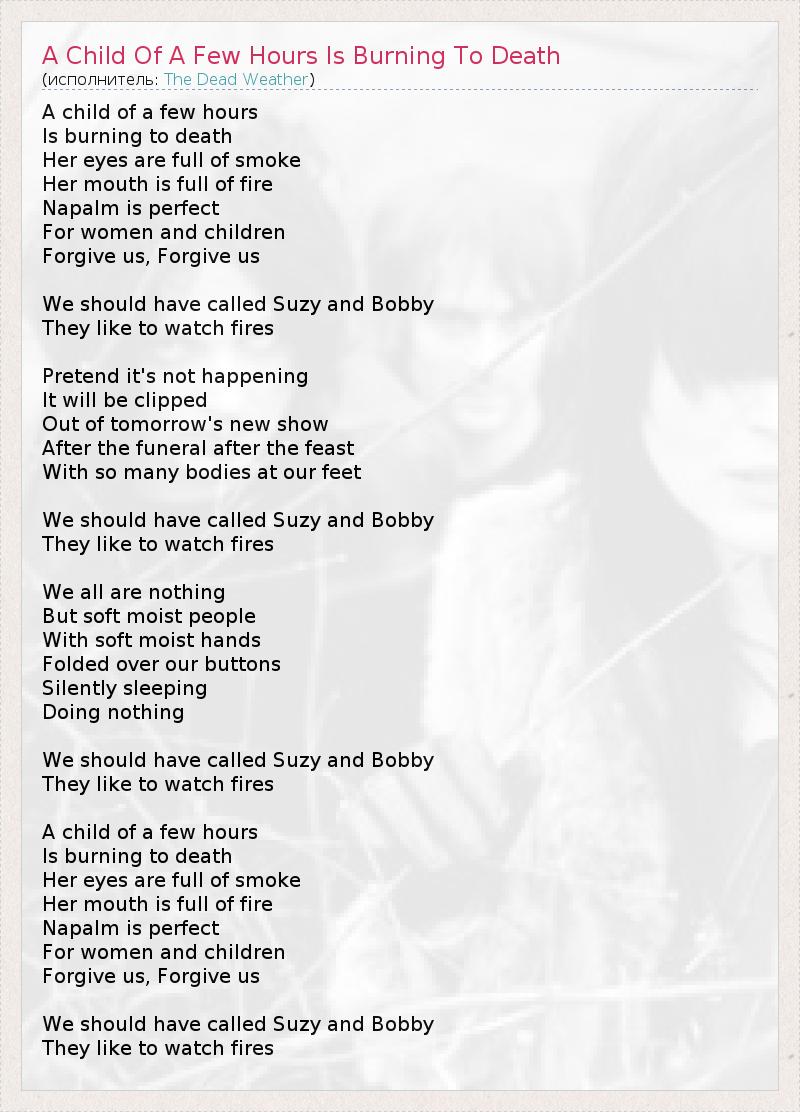 А как ты думаешь, о чем песня "A Child Of A Few Hours Is Burning To Death" ?