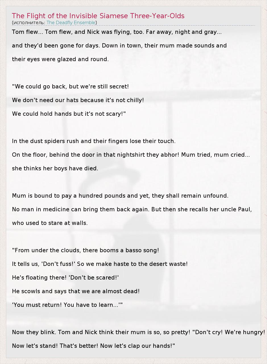 А как ты думаешь, о чем песня "The Flight of the Invisible Siamese Three-Year-Olds" ?