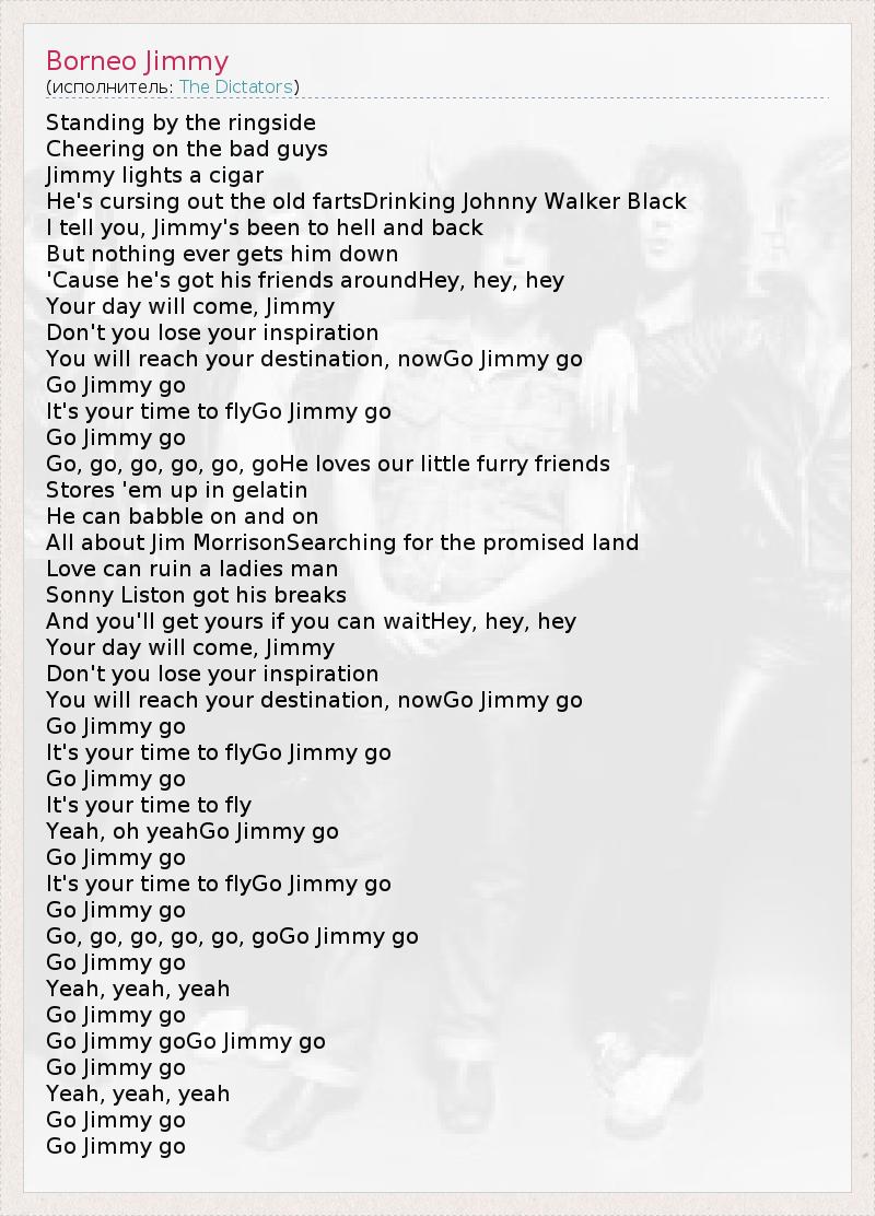 Standing by the ringside Cheering on the bad guys Jimmy lights a cigar He's cursing out the old fartsDrinking Johnny Walker Black I tell you, Jimmy's been to hell and back But nothing ever gets him down 'Cause he's got his friends aroundHey, hey, hey Your day will come, Jimmy Don't you lose your inspiration You will reach your destination, nowGo Jimmy go Go Jimmy go It's your time to flyGo Jimmy go Go Jimmy go Go, go, go, go, go, goHe loves our little furry friends Stores 'em up in gelatin He can babble on and on All about Jim MorrisonSearching for the promised land Love can ruin a ladies man Sonny Liston got his breaks And you'll get yours if you can waitHey, hey, hey Your day will come, Jimmy Don't you lose your inspiration You will reach your destination, nowGo Jimmy go Go Jimmy go It's your time to flyGo Jimmy go Go Jimmy go It's your time to fly Yeah, oh yeahGo Jimmy go Go Jimmy go It's your time to flyGo Jimmy go Go Jimmy go Go, go, go, go, go, goGo Jimmy go Go Jimmy go Yeah, yeah, yeah Go Jimmy go Go Jimmy goGo Jimmy go Go Jimmy go Yeah, yeah, yeah Go Jimmy go Go Jimmy go