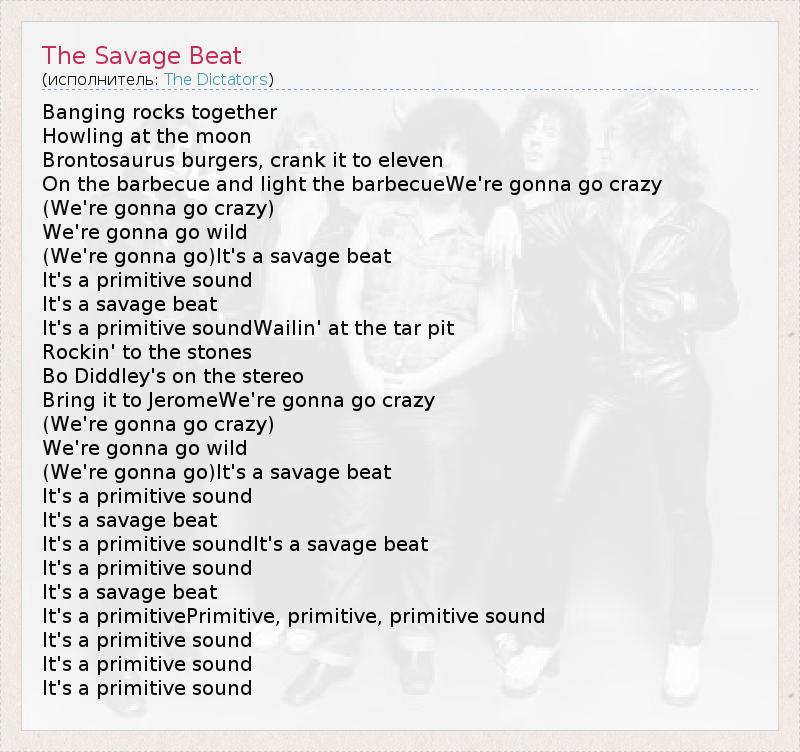 Banging rocks together Howling at the moon Brontosaurus burgers, crank it to eleven On the barbecue and light the barbecueWe're gonna go crazy (We're gonna go crazy) We're gonna go wild (We're gonna go)It's a savage beat It's a primitive sound It's a savage beat It's a primitive soundWailin' at the tar pit Rockin' to the stones Bo Diddley's on the stereo Bring it to JeromeWe're gonna go crazy (We're gonna go crazy) We're gonna go wild (We're gonna go)It's a savage beat It's a primitive sound It's a savage beat It's a primitive soundIt's a savage beat It's a primitive sound It's a savage beat It's a primitivePrimitive, primitive, primitive sound It's a primitive sound It's a primitive sound It's a primitive sound