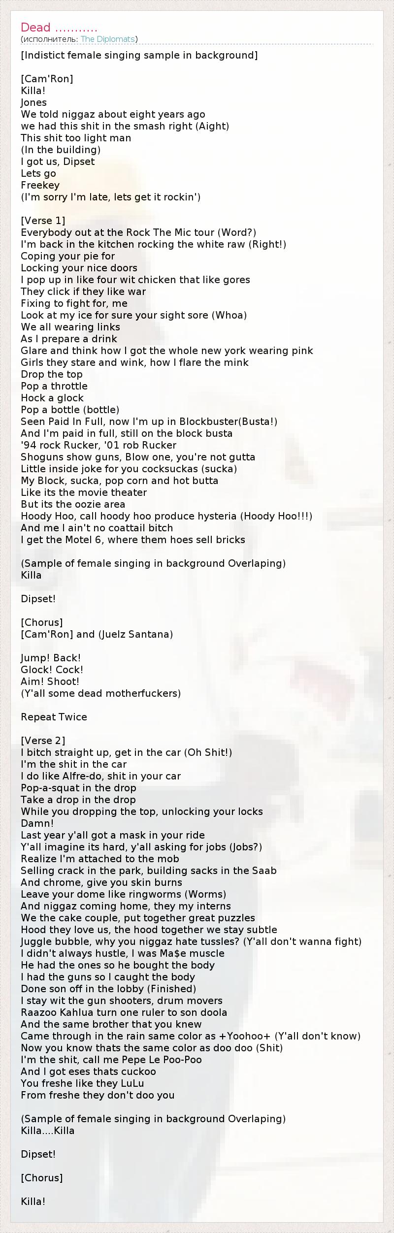 Это интересно:Хип-Хоп группа из Гарлема, Нью-Йорк, также известная как Dipset. Группа сформирована в 2002 году Cam'Ron, Jim Jones & Freeky Zekey.Список артистов:Cam’ronJim JonesJuelz SantanaJ.R. WriterMustie Tha DawnHell Rell40 Cal.Freekey Zekey... продолжение