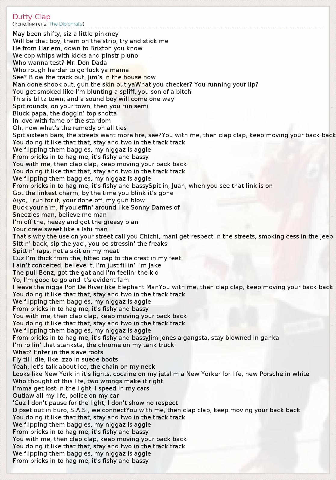 May been shifty, siz a little pinkney Will be that boy, them on the strip, try and stick me He from Harlem, down to Brixton you know We cop whips with kicks and pinstrip uno Who wanna test? Mr. Don Dada Who rough harder to go fuck ya mama See? Blow the track out, Jim's in the house now Man done shook out, gun the skin out yaWhat you checker? You running your lip? You get smoked like I'm blunting a spliff, you son of a bitch This is blitz town, and a sound boy will come one way Spit rounds, on your town, then you run semi Bluck papa, the doggin' top shotta In love with fame or the stardom Oh, now what's the remedy on all ties Spit sixteen bars, the streets want more fire, see?You with me, then clap clap, keep moving your back back You doing it like that that, stay and two in the track track We flipping them baggies, my niggaz is aggie From bricks in to hag me, it's fishy and bassy You with me, then clap clap, keep moving your back back You doing it like that that, stay and two in the track track We flipping them baggies, my niggaz is aggie From bricks in to hag me, it's fishy and bassySpit in, Juan, when you see that link is on Got the linkest charm, by the time you blink it's gone Aiyo, I run for it, your done off, my gun blow Buck your aim, if you effin' around like Sonny Dames of Sneezies man, believe me man I'm off the, heezy and got the greasy plan Your crew sweet like a Ishi man That's why the use on your street call you Chichi, manI get respect in the streets, smoking cess in the jeep Sittin' back, sip the yac', you be stressin' the freaks Spittin' raps, not a skit on my meat Cuz I'm thick from the, fitted cap to the crest in my feet I ain't conceited, believe it, I'm just fillin' I'm Jake The pull Benz, got the gat and I'm feelin' the kid Yo, I'm good to go and it's evident fam I leave the nigga Pon De River like Elephant ManYou with me, then clap clap, keep moving your back back You doing it like that that, stay and two in the track track We flipping them baggies, my niggaz is aggie From bricks in to hag me, it's fishy and bassy You with me, then clap clap, keep moving your back back You doing it like that that, stay and two in the track track We flipping them baggies, my niggaz is aggie From bricks in to hag me, it's fishy and bassyJim Jones a gangsta, stay blowned in ganka I'm rollin' that stanksta, the chrome on my tank truck What? Enter in the slave roots Fly til I die, like Izzo in suede boots Yeah, let's talk about ice, the chain on my neck Looks like New York in it's lights, cocaine on my jetsI'm a New Yorker for life, new Porsche in white Who thought of this life, two wrongs make it right I'mma get lost in the light, I speed in my cars Outlaw all my life, police on my car 'Cuz I don't pause for the light, I don't show no respect Dipset out in Euro, S.A.S., we connectYou with me, then clap clap, keep moving your back back You doing it like that that, stay and two in the track track We flipping them baggies, my niggaz is aggie From bricks in to hag me, it's fishy and bassy You with me, then clap clap, keep moving your back back You doing it like that that, stay and two in the track track We flipping them baggies, my niggaz is aggie From bricks in to hag me, it's fishy and bassy