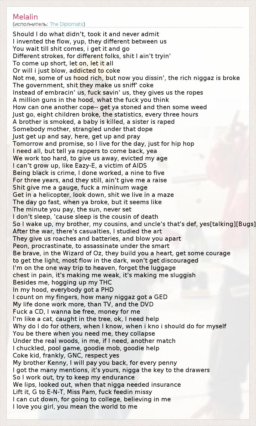 Should I do what didn't, took it and never admit I invented the flow, yup, they different between us You wait till shit comes, i get it and go Different strokes, for different folks, shit I ain't tryin' To come up short, let on, let it all Or will i just blow, addicted to coke Not me, some of us hood rich, but now you dissin', the rich niggaz is broke The government, shit they make us sniff' coke Instead of embracin' us, fuck savin' us, they gives us the ropes A million guns in the hood, what the fuck you think How can one another cope-- get ya stoned and then some weed Just go, eight children broke, the statistics, every three hours A brother is smoked, a baby is killed, a sister is raped Somebody mother, strangled under that dope Just get up and say, here, get up and pray Tomorrow and promise, so I live for the day, just for hip hop I need all, but tell ya rappers to come back, yea We work too hard, to give us away, evicted my age I can't grow up, like Eazy-E, a victim of AIDS Being black is crime, I done worked, a nine to five For three years, and they still, ain't give me a raise Shit give me a gauge, fuck a mininum wage Get in a helicopter, look down, shit we live in a maze The day go fast, when ya broke, but it seems like The minute you pay, the sun, never set I don't sleep, 'cause sleep is the cousin of death So I wake up, my brother, my cousins, and uncle's that's def, yes[talking][Bugs] After the war, there's casualties, I studied the art They give us roaches and batteries, and blow you apart Peon, procrastinate, to assassinate under the smart Be brave, in the Wizard of Oz, they build you a heart, get some courage to get the light, most flow in the dark, won't get discouraged I'm on the one way trip to heaven, forget the luggage chest in pain, it's making me weak, it's making me sluggish Besides me, hogging up my THC In my hood, everybody got a PHD I count on my fingers, how many niggaz got a GED My life done work more, than TV, and the DVD Fuck a CD, I wanna be free, money for me I'm like a cat, caught in the tree, ok, I need help Why do I do for others, when I know, when i kno i should do for myself You be there when you need me, they collapse Under the real woods, in me, if I need, another match I chuckled, pool game, goodie mob, goodie help Coke kid, frankly, GNC, respect yes My brother Kenny, I will pay you back, for every penny I got the many mentions, it's yours, nigga the key to the drawers So I work out, try to keep my endurance We lips, looked out, when that nigga needed insurance Lift it, G to E-N-T, Miss Pam, fuck feedin missy I can cut down, for going to college, believing in me I love you girl, you mean the world to me