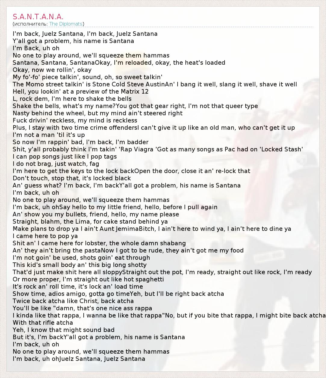 An' guess what? I'm back, I'm backY'all got a problem, his name is Santana