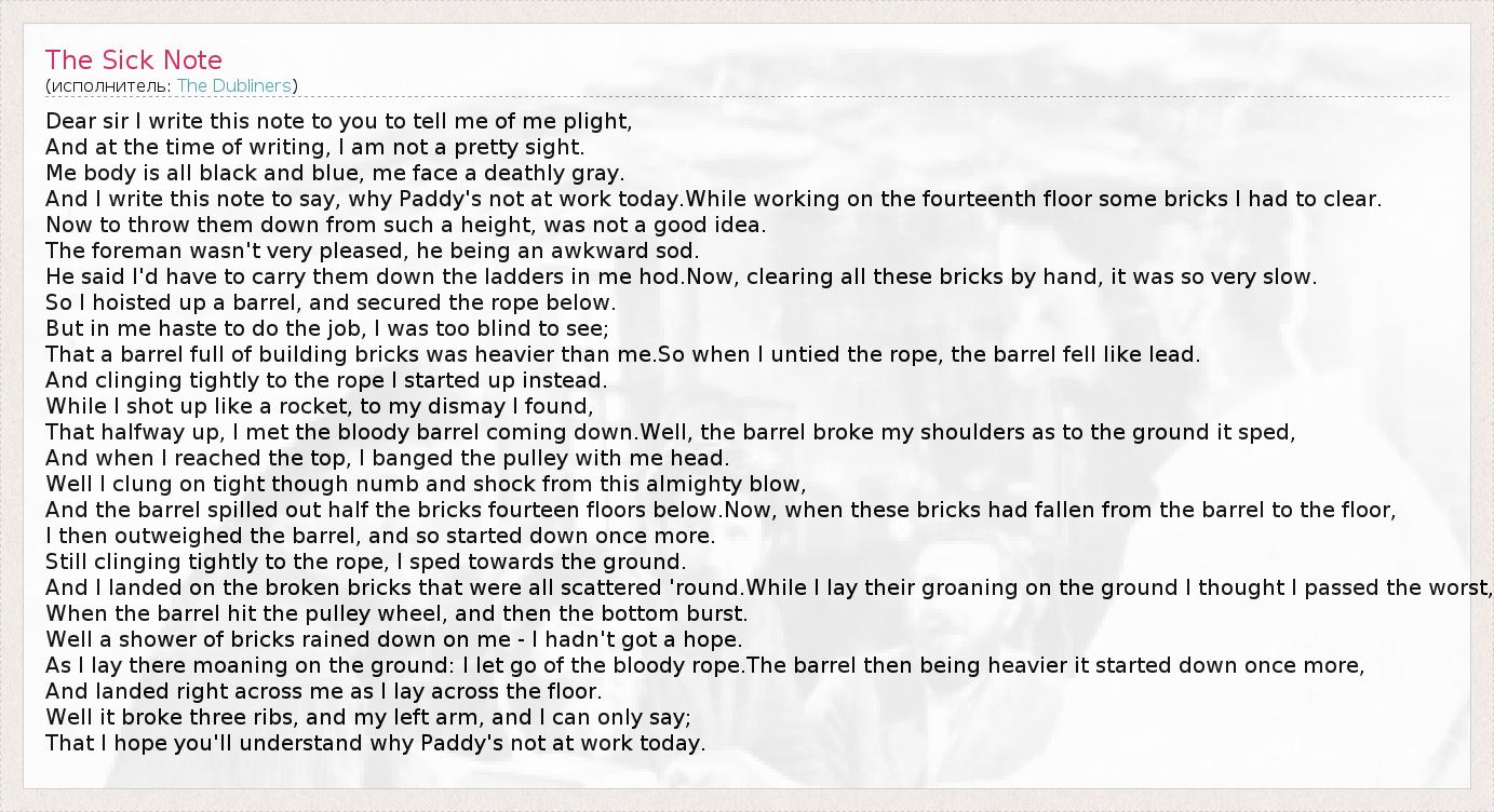 And I write this note to say, why Paddy's not at work today.While working on the fourteenth floor some bricks I had to clear.