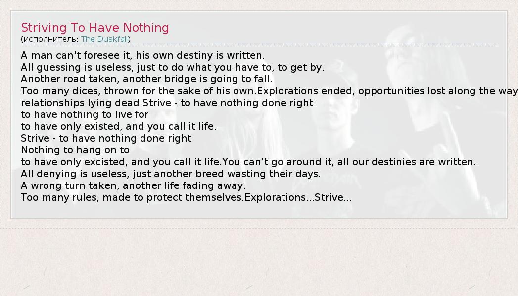 А как ты думаешь, о чем песня "Striving To Have Nothing" ?