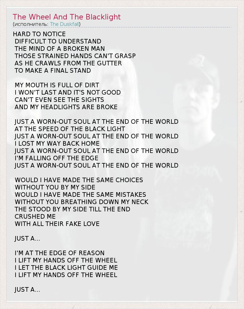 HARD TO NOTICE DIFFICULT TO UNDERSTAND THE MIND OF A BROKEN MAN THOSE STRAINED HANDS CAN'T GRASP AS HE CRAWLS FROM THE GUTTER TO MAKE A FINAL STAND MY MOUTH IS FULL OF DIRT I WON'T LAST AND IT'S NOT GOOD CAN'T EVEN SEE THE SIGHTS AND MY HEADLIGHTS ARE BROKE JUST A WORN-OUT SOUL AT THE END OF THE WORLD AT THE SPEED OF THE BLACK LIGHT JUST A WORN-OUT SOUL AT THE END OF THE WORLD I LOST MY WAY BACK HOME JUST A WORN-OUT SOUL AT THE END OF THE WORLD I'M FALLING OFF THE EDGE JUST A WORN-OUT SOUL AT THE END OF THE WORLD WOULD I HAVE MADE THE SAME CHOICES WITHOUT YOU BY MY SIDE WOULD I HAVE MADE THE SAME MISTAKES WITHOUT YOU BREATHING DOWN MY NECK THE STOOD BY MY SIDE TILL THE END CRUSHED ME WITH ALL THEIR FAKE LOVE JUST A... I'M AT THE EDGE OF REASON I LIFT MY HANDS OFF THE WHEEL I LET THE BLACK LIGHT GUIDE ME I LIFT MY HANDS OFF THE WHEEL JUST A...