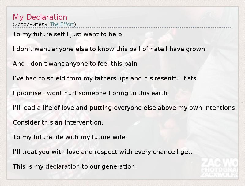 To my future self I just want to help. I don't want anyone else to know this ball of hate I have grown. And I don't want anyone to feel this pain I've had to shield from my fathers lips and his resentful fists. I promise I wont hurt someone I bring to this earth. I'll lead a life of love and putting everyone else above my own intentions. Consider this an intervention. To my future life with my future wife. I'll treat you with love and respect with every chance I get. This is my declaration to our generation.