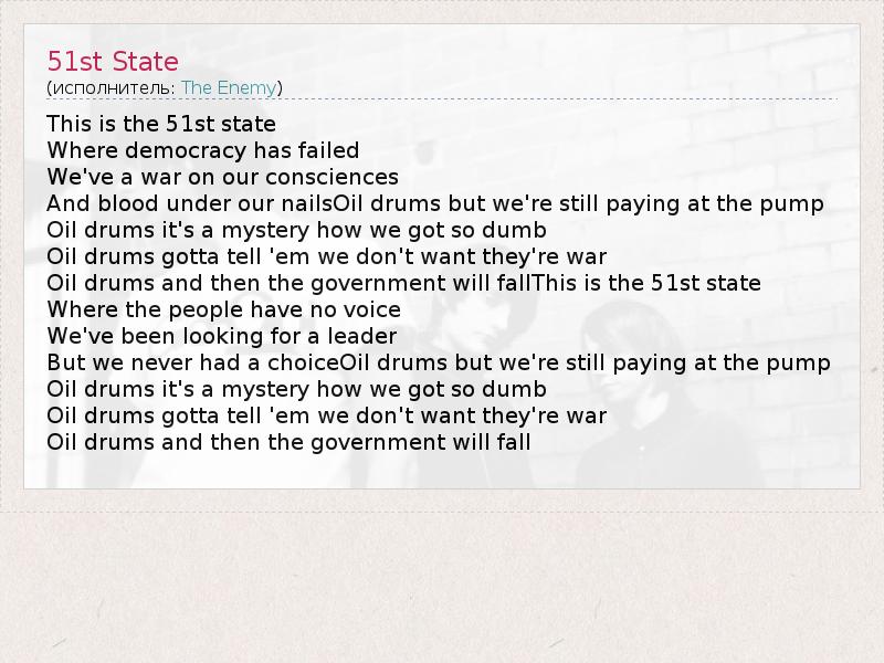 Это интересно:The Enemy - английская рок-банда. Подписаны на Warner Music Group (UK). 16 июля вышел их дебютный альбом "We'll Live and Die in These Towns", который возглавил британский альбомный чарт. Группа выступала на крупных летних фестивалях, включая Гластонберри, T In The Park. 26 августа 2007 года The Enemy разогревали The Rolling Stones в Лондоне.Состав группы:Том Кларк (вокал, гитара) Лаэм Уотс (барабаны) Энди Хопкинс (басс,... продолжение