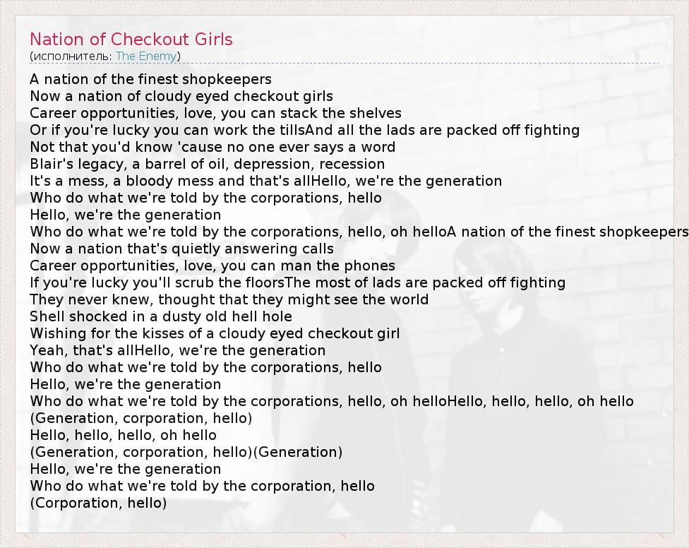 А как ты думаешь, о чем песня "Nation of Checkout Girls" ?