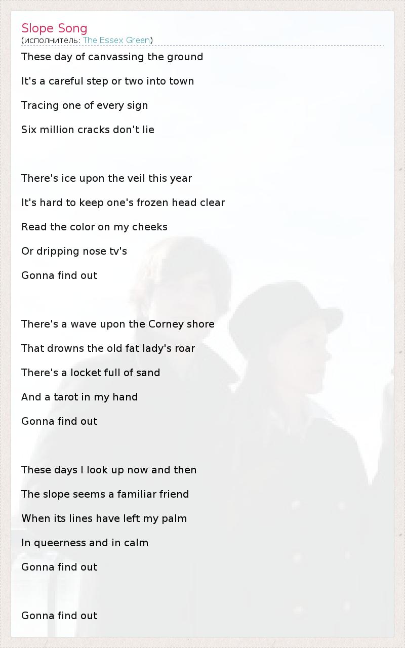 These day of canvassing the ground It's a careful step or two into town Tracing one of every sign Six million cracks don't lie There's ice upon the veil this year It's hard to keep one's frozen head clear Read the color on my cheeks Or dripping nose tv's Gonna find out There's a wave upon the Corney shore That drowns the old fat lady's roar There's a locket full of sand And a tarot in my hand Gonna find out These days I look up now and then The slope seems a familiar friend When its lines have left my palm In queerness and in calm Gonna find out Gonna find out