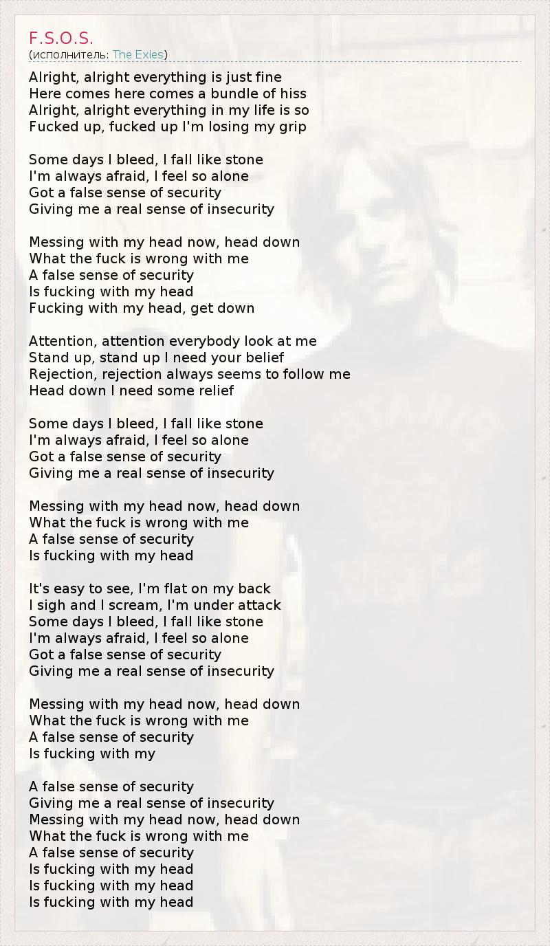 Alright, alright everything is just fine Here comes here comes a bundle of hiss Alright, alright everything in my life is so Fucked up, fucked up I'm losing my grip Some days I bleed, I fall like stone I'm always afraid, I feel so alone Got a false sense of security Giving me a real sense of insecurity Messing with my head now, head down What the fuck is wrong with me A false sense of security Is fucking with my head Fucking with my head, get down Attention, attention everybody look at me Stand up, stand up I need your belief Rejection, rejection always seems to follow me Head down I need some relief Some days I bleed, I fall like stone I'm always afraid, I feel so alone Got a false sense of security Giving me a real sense of insecurity Messing with my head now, head down What the fuck is wrong with me A false sense of security Is fucking with my head It's easy to see, I'm flat on my back I sigh and I scream, I'm under attack Some days I bleed, I fall like stone I'm always afraid, I feel so alone Got a false sense of security Giving me a real sense of insecurity Messing with my head now, head down What the fuck is wrong with me A false sense of security Is fucking with my A false sense of security Giving me a real sense of insecurity Messing with my head now, head down What the fuck is wrong with me A false sense of security Is fucking with my head Is fucking with my head Is fucking with my head