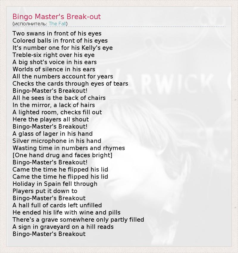 Two swans in front of his eyes Colored balls in front of his eyes It's number one for his Kelly's eye Treble-six right over his eye A big shot's voice in his ears Worlds of silence in his ears All the numbers account for years Checks the cards through eyes of tears Bingo-Master's Breakout! All he sees is the back of chairs In the mirror, a lack of hairs A lighted room, checks fill out Here the players all shout Bingo-Master's Breakout! A glass of lager in his hand Silver microphone in his hand Wasting time in numbers and rhymes [One hand drug and faces bright] Bingo-Master's Breakout! Came the time he flipped his lid Came the time he flipped his lid Holiday in Spain fell through Players put it down to Bingo-Master's Breakout A hall full of cards left unfilled He ended his life with wine and pills There's a grave somewhere only partly filled A sign in graveyard on a hill reads Bingo-Master's Breakout