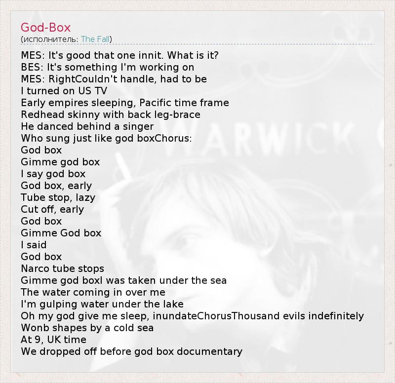 Это интересно:The Fall — британская рок-группа, основанная в 1976 году в Манчестере поэтом и автором песен Марком Э. Смитом и названная в честь романа Альбера Камю «Падение» (1956). The Fall, выпустившие в общей сложности более 80 альбомов и 40 синглов, продолжают оставаться (согласно Allmusic) одной из самых авторитетных, долговечных и творчески активных групп постпанка. Только на BBC у Джона Пила группа записывалась... продолжение