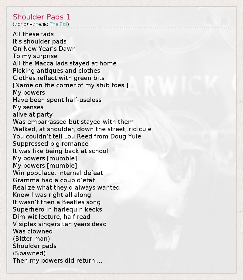 All these fads It's shoulder pads On New Year's Dawn To my surprise All the Macca lads stayed at home Picking antiques and clothes Clothes reflect with green bits [Name on the corner of my stub toes.] My powers Have been spent half-useless My senses alive at party Was embarrassed but stayed with them Walked, at shoulder, down the street, ridicule You couldn't tell Lou Reed from Doug Yule Suppressed big romance It was like being back at school My powers [mumble] My powers [mumble] Win populace, internal defeat Gramma had a coup d'etat Realize what they'd always wanted Knew I was right all along It wasn't then a Beatles song Superhero in harlequin kecks Dim-wit lecture, half read Visiplex singers ten years dead Was clowned (Bitter man) Shoulder pads (Spawned) Then my powers did return....