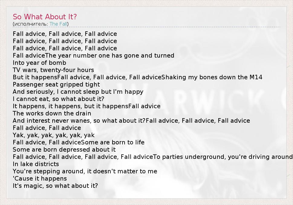 Fall advice, Fall advice, Fall advice Fall advice, Fall advice, Fall advice Fall advice, Fall advice, Fall advice Fall adviceThe year number one has gone and turned Into year of bomb TV wars, twenty-four hours But it happensFall advice, Fall advice, Fall adviceShaking my bones down the M14 Passenger seat gripped tight And seriously, I cannot sleep but I'm happy I cannot eat, so what about it? It happens, it happens, but it happensFall advice The works down the drain And interest never wanes, so what about it?Fall advice, Fall advice, Fall advice Fall advice, Fall advice Yak, yak, yak, yak, yak, yak Fall advice, Fall adviceSome are born to life Some are born depressed about it Fall advice, Fall advice, Fall advice, Fall adviceTo parties underground, you're driving around In lake districts You're stepping around, it doesn't matter to me 'Cause it happens It's magic, so what about it?