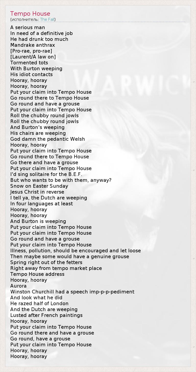 A serious man In need of a definitive job He had drunk too much Mandrake anthrax [Pro-rae, pro-rae] [Laurent/A law on] Tormented tots With Burton weeping His idiot contacts Hooray, hooray Hooray, hooray Put your claim into Tempo House Go round there to Tempo House Go round and have a grouse Put your claim into Tempo House Roll the chubby round jowls Roll the chubby round jowls And Burton's weeping His chairs are weeping God damn the pedantic Welsh Hooray, hooray Put your claim into Tempo House Go round there to Tempo House Go there and have a grouse Put your claim into Tempo House I'd sing solitaire for the B.E.F. But who wants to be with them, anyway? Snow on Easter Sunday Jesus Christ in reverse I tell ya, the Dutch are weeping In four languages at least Hooray, hooray Hooray, hooray And Burton is weeping Put your claim into Tempo House Put your claim into Tempo House Go round and have a grouse Put your claim into Tempo House Illness, pollution, should be encouraged and let loose Then maybe some would have a genuine grouse Spring right out of the fetters Right away from tempo market place Tempo House address Hooray, hooray Aurora Winston Churchill had a speech imp-p-p-pediment And look what he did He razed half of London And the Dutch are weeping Lusted after French paintings Hooray, hooray Put your claim into Tempo House Go round there and have a grouse Go round, have a grouse Put your claim into Tempo House Hooray, hooray Hooray, hooray