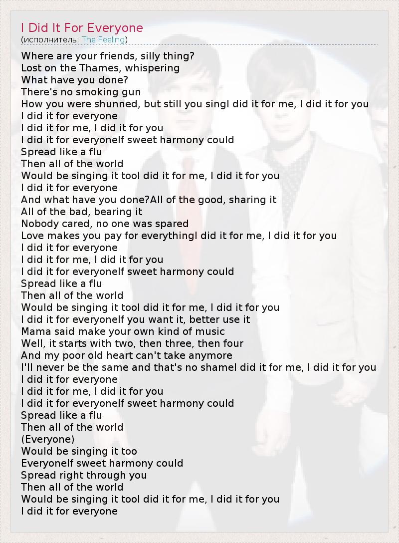 Where are your friends, silly thing? Lost on the Thames, whispering What have you done? There's no smoking gun How you were shunned, but still you singI did it for me, I did it for you I did it for everyone I did it for me, I did it for you I did it for everyoneIf sweet harmony could Spread like a flu Then all of the world Would be singing it tooI did it for me, I did it for you I did it for everyone And what have you done?All of the good, sharing it All of the bad, bearing it Nobody cared, no one was spared Love makes you pay for everythingI did it for me, I did it for you I did it for everyone I did it for me, I did it for you I did it for everyoneIf sweet harmony could Spread like a flu Then all of the world Would be singing it tooI did it for me, I did it for you I did it for everyoneIf you want it, better use it Mama said make your own kind of music Well, it starts with two, then three, then four And my poor old heart can't take anymore I'll never be the same and that's no shameI did it for me, I did it for you I did it for everyone I did it for me, I did it for you I did it for everyoneIf sweet harmony could Spread like a flu Then all of the world (Everyone) Would be singing it too EveryoneIf sweet harmony could Spread right through you Then all of the world Would be singing it tooI did it for me, I did it for you I did it for everyone