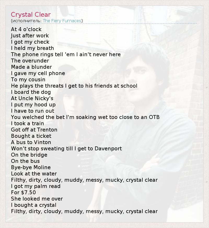 At 4 o'clock Just after work I got my check I held my breath The phone rings tell 'em I ain't never here The overunder Made a blunder I gave my cell phone To my cousin He plays the threats I get to his friends at school I board the dog At Uncle Nicky's I put my hood up I have to run out You welched the bet I'm soaking wet too close to an OTB I took a train Got off at Trenton Bought a ticket A bus to Vinton Won't stop sweating till I get to Davenport On the bridge On the bus Bye-bye Moline Look at the water Filthy, dirty, cloudy, muddy, messy, mucky, crystal clear I got my palm read For $7.50 She looked me over I bought a crystal Filthy, dirty, cloudy, muddy, messy, mucky, crystal clear