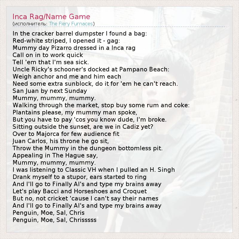 А как ты думаешь, о чем песня "Inca Rag/Name Game" ?