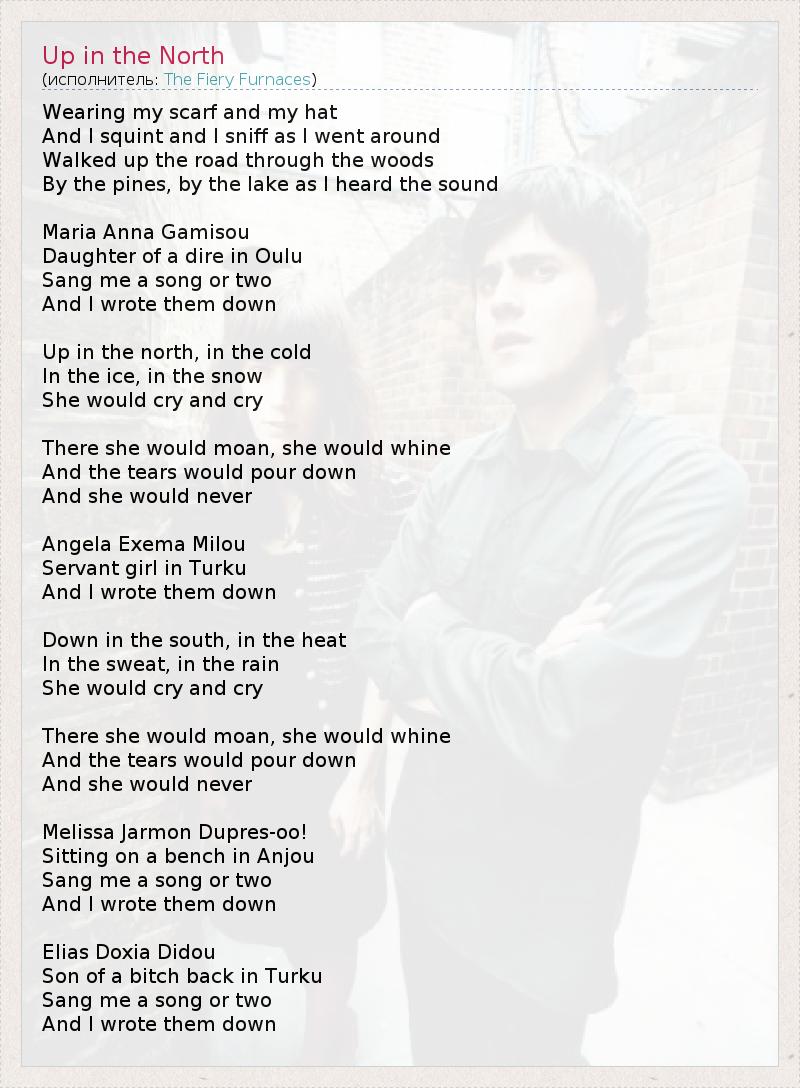 Wearing my scarf and my hat And I squint and I sniff as I went around Walked up the road through the woods By the pines, by the lake as I heard the sound Maria Anna Gamisou Daughter of a dire in Oulu Sang me a song or two And I wrote them down Up in the north, in the cold In the ice, in the snow She would cry and cry There she would moan, she would whine And the tears would pour down And she would never Angela Exema Milou Servant girl in Turku And I wrote them down Down in the south, in the heat In the sweat, in the rain She would cry and cry There she would moan, she would whine And the tears would pour down And she would never Melissa Jarmon Dupres-oo! Sitting on a bench in Anjou Sang me a song or two And I wrote them down Elias Doxia Didou Son of a bitch back in Turku Sang me a song or two And I wrote them down