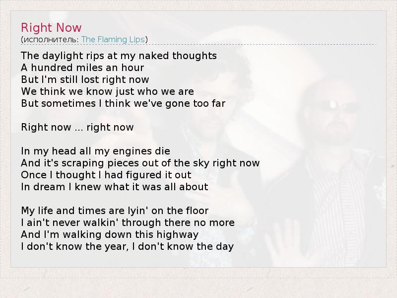 The daylight rips at my naked thoughts A hundred miles an hour But I'm still lost right now We think we know just who we are But sometimes I think we've gone too far Right now ... right now In my head all my engines die And it's scraping pieces out of the sky right now Once I thought I had figured it out In dream I knew what it was all about My life and times are lyin' on the floor I ain't never walkin' through there no more And I'm walking down this highway I don't know the year, I don't know the day