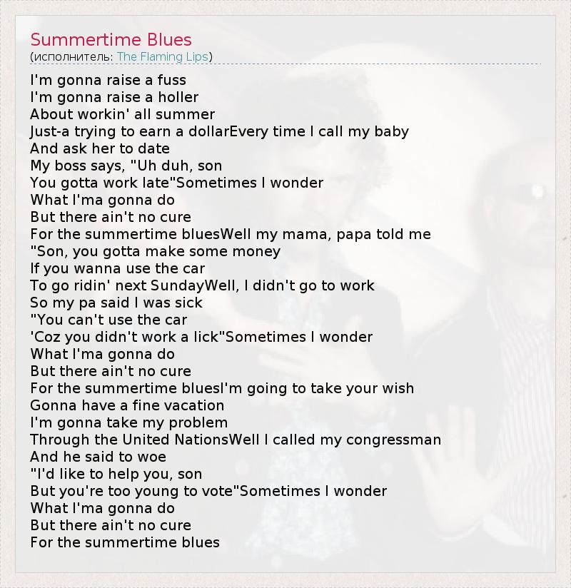 I'm gonna raise a fuss I'm gonna raise a holler About workin' all summer Just-a trying to earn a dollarEvery time I call my baby And ask her to date My boss says, "Uh duh, son You gotta work late"Sometimes I wonder What I'ma gonna do But there ain't no cure For the summertime bluesWell my mama, papa told me "Son, you gotta make some money If you wanna use the car To go ridin' next SundayWell, I didn't go to work So my pa said I was sick "You can't use the car 'Coz you didn't work a lick"Sometimes I wonder What I'ma gonna do But there ain't no cure For the summertime bluesI'm going to take your wish Gonna have a fine vacation I'm gonna take my problem Through the United NationsWell I called my congressman And he said to woe "l'd like to help you, son But you're too young to vote"Sometimes I wonder What I'ma gonna do But there ain't no cure For the summertime blues